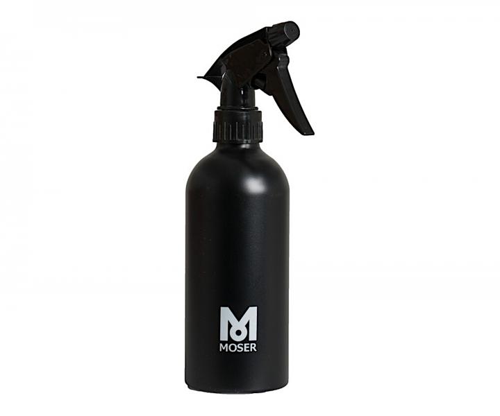 Profesjonalny spryskiwacz z pompką firmy Moser wytwarza delikatną mgiełkę wodną. Czarna butelka z logo marki jest wykonana z aluminium, dzięki czemu jest bardziej trwała. Pojemność spryskiwacza wynosi 250 ml.