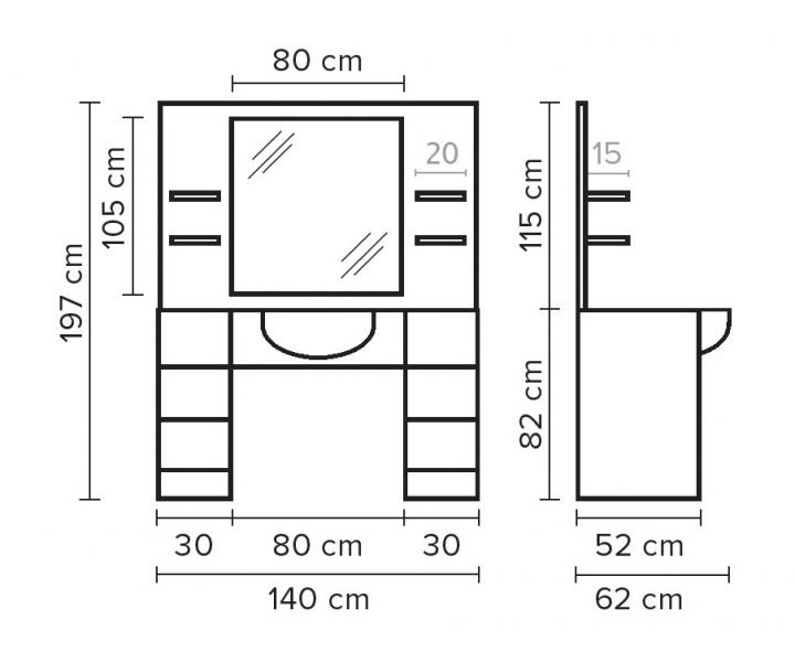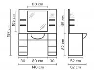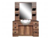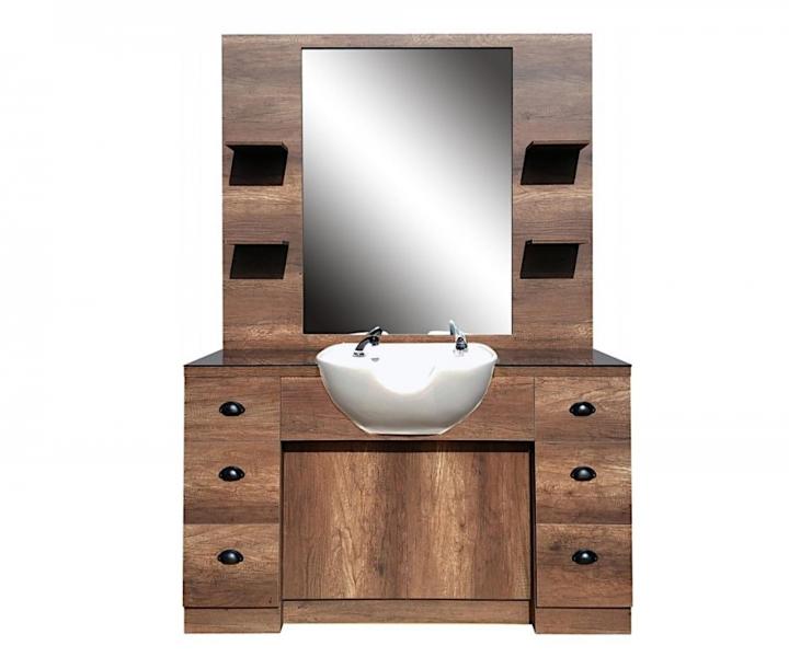 Myjnia fryzjerska Hairway Barry ze zintegrowanym, ceramicznym, białym zlewem posiada typowe wycięcie, duże lustro i liczne schowki. Stanowi zatem niezbędny element każdego salonu fryzjerskiego. Powierzchnia robocza wykonana została ze szkła, a korpus, drzwi i półki z drewna z wodoodpornym wykończeniem.