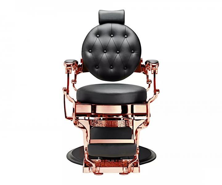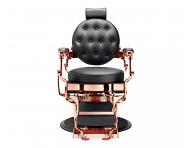 Luksusowy fotel fryzjerski Hairway Romeo w kolorze czarnym z metalową konstrukcją w kolorze różowego złota doda odpowiedniej atmosfery każdemu salonowi fryzjerskiemu. Fotel posiada odchylane o 145° oparcie zabezpieczone dźwignią z boku fotela. Szereg udogodnień, takich jak regulowany i zdejmowany zagłówek, wyściełane podłokietniki, podnóżek i ogólne miękkie obicie zapewniają maksymalny komfort użytkownika. Stały podnóżek jest zintegrowany ze składanym oparciem, a wyściełany, składany podnóżek zapewnia zwiększony komfort w pozycji leżącej. Fotel posiada regulację wysokości siedziska za pomocą tłoka hydraulicznego z możliwością jego obracania i blokady. Wysokiej jakości sztuczna skóra sprawia, że krzesło jest łatwe w utrzymaniu. Stabilność całego fotela zapewnia solidna okrągła podstawa o średnicy 67 cm.