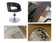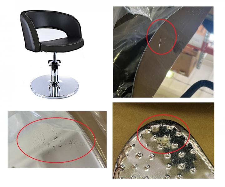Produkt posiada niewielkie wady powierzchniowe - rysy i plamki rdzy na podstawie i podnóżku. Są to jedynie wady kosmetyczne, które nie wpływają na funkcjonalność i użytkowanie fotela. Zdjęcia mają charakter poglądowy, każdy fotel posiada inne wady.