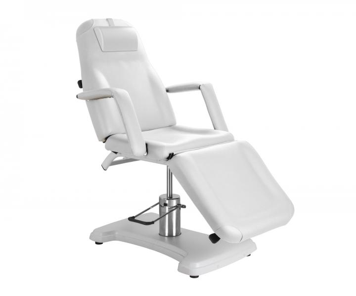Fotel hydrauliczny kosmetyczny oraz do masażu SilverFox w kolorze białym wyposażony jest w hydrauliczną dźwignię nożną, dzięki której można regulować wysokość fotela od 55 cm do 75 cm. Fotel posiada również funkcję niezależnej regulacji oparcia (o 75°) i podnóżka (o 50°). Fotel wyposażony jest w otwór na twarz ze zdejmowaną poduszką pod głowę oraz zdejmowane podłokietniki.