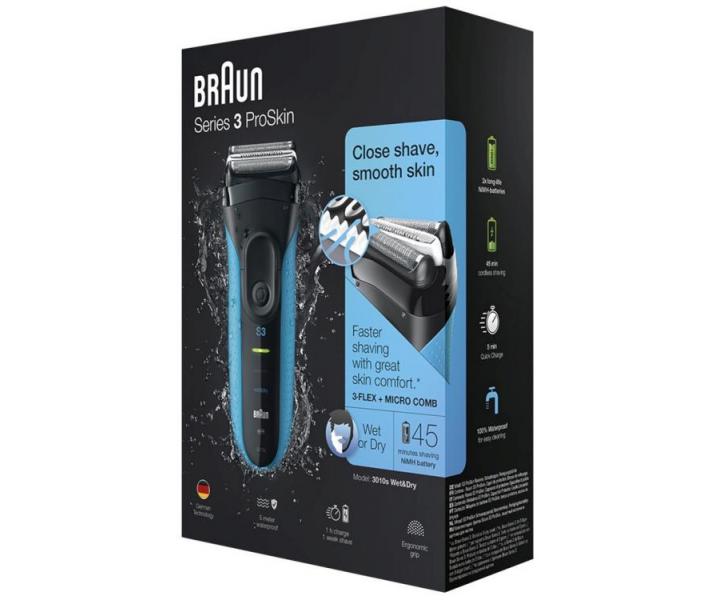 Golarka Braun Series 3 Pro Skin 3010s łączy w sobie dwa wyjątkowo cienkie ostrza i środkowy trymer. Dzięki tej innowacyjnej technologii golarka radzi sobie również z uporczywym trzydniowym zarostem bez konieczności wcześniejszego przycinania. 100% wodoodporna, umożliwia golenie na mokro z użyciem żelu lub pianki lub bez, a także klasyczne golenie na sucho. Możliwe jest również bezpieczne korzystanie z golarki podczas kąpieli. Wydajny akumulator ładuje się w pełni w ciągu zaledwie 1 godziny, zapewniając płynną 45-minutową pracę.