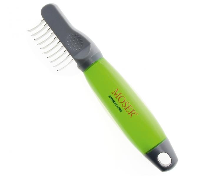 Zgrzebło do wyczesywania sierści Moser Animal Line delikatnie przecina i usuwa skołtunioną sierść. Przeznaczone do gęstej i długiej sierści dużych, średnich i małych ras. Wygodny żelowy uchwyt precyzyjnie dopasowuje się do dłoni. Dzięki temu grzebień jest poręczny i nie wyślizguje się z dłoni. Antypoślizgowe wyprofilowanie na palec umożliwia wygodniejsze posługiwanie się grzebieniem. Uchwyt posiada oczko do zawieszania i odkładania.