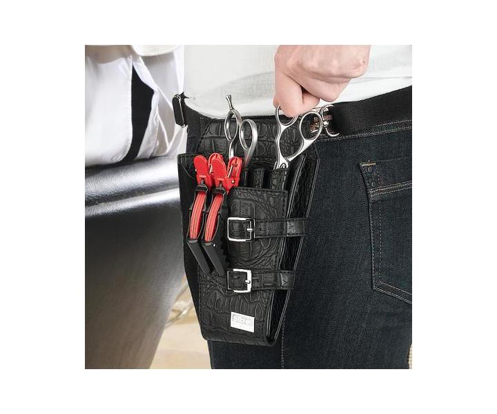 Kabura fryzjerska Sibel Boy 4 na nożyczki i inne narzędzia fryzjerskie jest wykonana z wysokiej jakości ekoskóry z wzorem krokodylej skóry. Kabura posiada regulowany pasek wokół talii oraz 4 przegródki na nożyczki i oddzielną kieszeń na grzebienie i inne narzędzia.