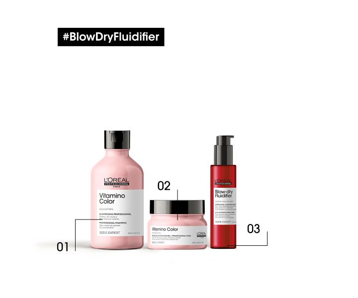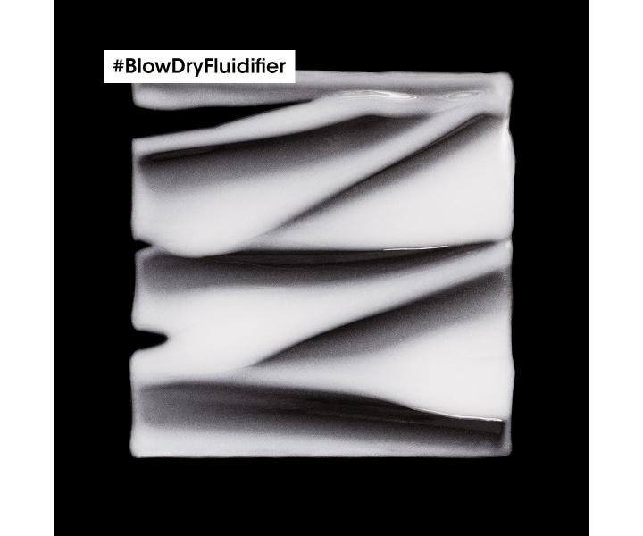 Krem termoochronny Loréal Professionnel Serie Expert Blow Dry Fluidifier z pamięcią kształtu i możliwością ponownej zmiany stylizacji. Wzbogacona proteinami roślinnymi formuła dociera do wrażliwych obszarów włókna włosa i wygładza jego powierzchnię bez obciążania. Proteiny roślinne to mieszanka 17 aminokwasów pochodzących z soi, kukurydzy i pszenicy, które znajdują się we włóknie włosa. Krem zapewnia włosom ochronę przed wysoką temperaturą do 230°C, nadaje im miękkość, połysk i ruch. Zapobiega puszeniu się włosów, zwalcza ich łamliwość, odżywia i wygładza włókno włosa. Ponadto można łatwo zmienić ostateczny kształt fryzury za pomocą dowolnego urządzenia do stylizacji termicznej w temperaturze powyżej 150 °C.