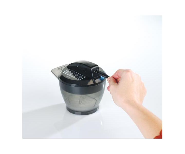 Mikser Sibel Color Economiser do mieszania farb i rozjaśniaczy jest nie tylko praktycznym, ale także bardzo ekonomicznym narzędziem dla każdego fryzjera. Elektryczny mikser zapewnia doskonałe i nie wymagające wysiłku mieszanie. Dzięki mikserowi konsystencja farby jest lepiej napowietrzona, bardziej gładka i ma większą objętość, zapewniając większy połysk i lepsze pokrycie siwych włosów, a także łatwiejszą aplikację farby. Mieszanka farby jest do 40% lepiej wymieszana niż w przypadku tradycyjnego mieszania ręcznego. Mikser można ustawić na automatyczny czas mieszania 45 sekund, 60 sekund, 75 sekund lub włączyć ręcznie z dowolnie wybranym czasem mieszania. W zestawie znajdują się cztery plastikowe miski do mieszania farb o pojemności 360 ml z zaznaczonymi z boku podziałkami (40-360 ml), trzy pędzle do farb o różnych wymiarach, metalowe mieszadło ze stali nierdzewnej do mieszania farb bez oksydantu oraz metalowe mieszadło pokryte tworzywem sztucznym do mieszania farb z oksydantem.