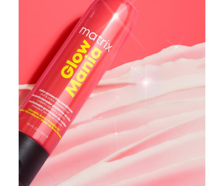 Odżywka Matrix Glow Mania Color Protecting Conditioner doskonale odżywia i chroni włosy, pozostawiając je miękkie, lśniące i łatwe do rozczesania. Dzięki silnemu połączeniu składników aktywnych, kwasu glikolowego, najdelikatniejszego z kwasów AHA i olejku z dzikiej róży, wnika głęboko we włókno włosa, wzmacniając je, podkreślając kolor i zapewniając długotrwałą intensywność koloru, która utrzymuje się do 8 tygodni. Bogata, kremowa i miękka konsystencja tworzy nawilżającą warstwę, która chroni włosy. Odżywka jest idealna do wszystkich rodzajów włosów farbowanych, zwłaszcza matowych i pozbawionych blasku. Zachowuje ich witalność, pozostawiając włosy miękkie, zdrowe i naturalnie lśniące. Zapach łączy w sobie świeże cytrusowe tony z subtelnymi kwiatowymi akcentami, które wzbogacone o słodkie nuty zapachowe tworzą zrównoważone i przyjemnie orzeźwiające wrażenie. Formuła nie zawiera siarczanów.