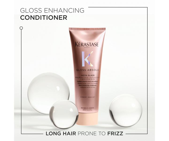 Odżywka Kérastase Gloss Absolu Insta Glaze ma lekką, ale intensywnie pielęgnującą konsystencję, która zwiększa połysk długich, podatnych na puszenie się włosów. Zapewnia włosom głębokie nawilżenie i objętość, poprawia elastyczność i ułatwia rozczesywanie. Włosy są niesamowicie gładkie, a ich powierzchnia idealnie odbija światło i zapewnia maksymalny połysk. Lekka konsystencja odżywki zmienia się w kremową pod wpływem kontaktu z wodą. Olejek z dzikiej róży jest bogaty w witaminy i przeciwutleniacze, które głęboko odżywiają włosy, przywracając im nawilżenie oraz nadając miękkość i blask. Pomaga zregenerować uszkodzone włókno włosa i chroni je przed szkodliwym działaniem czynników zewnętrznych. Kwas hialuronowy pomaga utrzymać optymalne nawilżenie włosów, poprawiając ich elastyczność i miękkość. Kwas glikolowy wygładza włókno włosa i nadaje włosom olśniewający połysk. Odżywka dodatkowo wzmacnia włosy, zapewniając im miękkość i połysk, które utrzymują się do czterech dni. Produkt jest wegański i pięknie pachnie świeżymi nutami cytrusów, drzewa sandałowego i wanilii.
