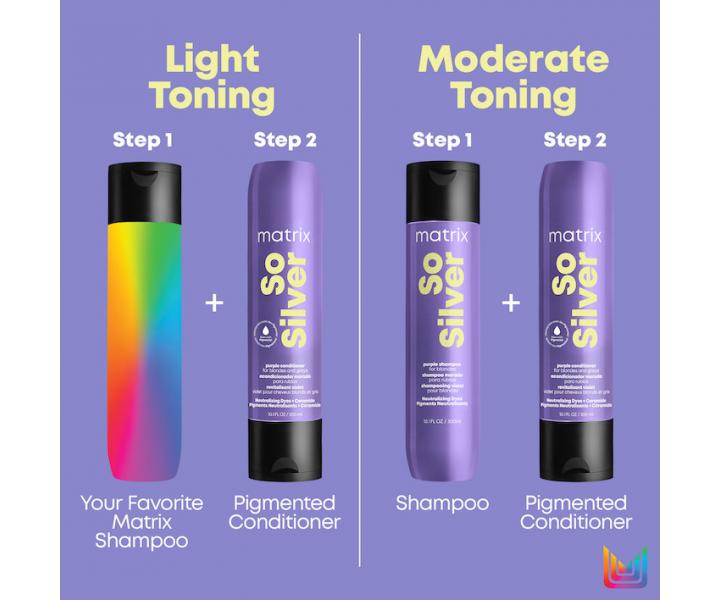 Wskazówka: Aby uzyskać intensywny efekt, zalecamy stosowanie w połączeniu z innymi produktami z serii Matrix So Silver w celu zneutralizowania żółtych odcieni. Aby uzyskać delikatniejszy odcień, stosuj po użyciu ulubionego szamponu Matrix.