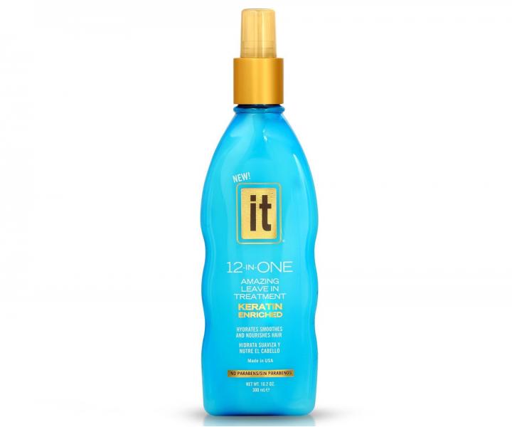 Odżywka bez spłukiwania It Haircare 12-in-One Leave in Treatment Keratin do kompleksowej regeneracji włosów. Głęboko odżywia włosy i odbudowuje ich strukturę. Formuła wzbogacona proteinami keratyny i olejem z ogórecznika, jest idealna do włosów suchych i puszących się. Ułatwia rozczesywanie, chroni włosy przed negatywnymi skutkami prostowania i suszenia w temperaturze do 240°C. Zapobiega łamaniu się włosów i rozdwajaniu końcówek, nadaje włosom jedwabisty wygląd i połysk.