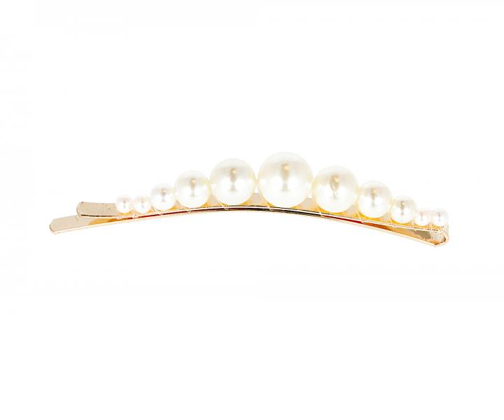 Płaska spinka Eurostil Professional w kolorze złotym o długości 8,5 cm jest ozdobiona perełkami o różnej wielkości, dzięki czemu nadaje się nie tylko dla panny młodej w dniu ślubu, ale także na różnego rodzaju przyjęcia i inne uroczystości. Spinka wykonana jest z mocnego materiału wysokiej jakości, dzięki czemu mocno trzyma się na włosach. Opakowanie zawiera dwie spinki do włosów.