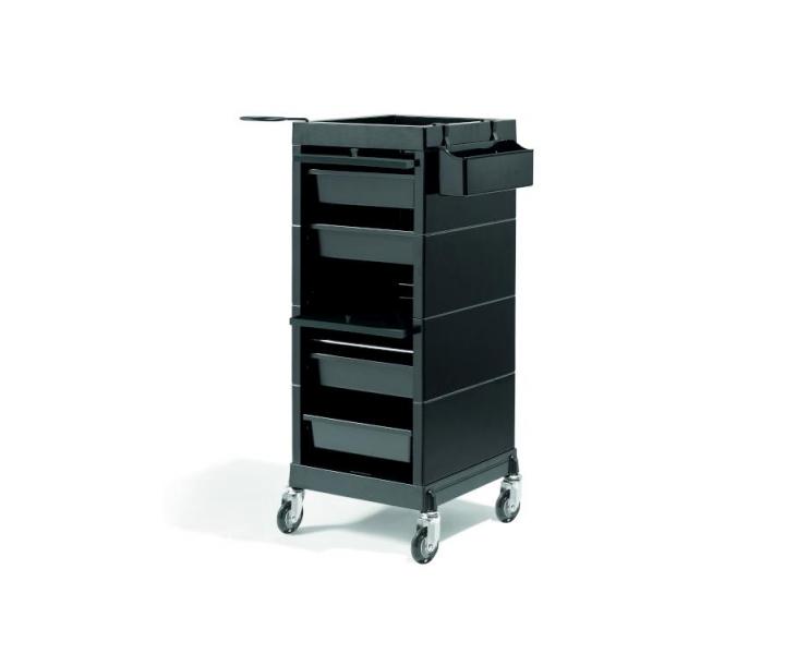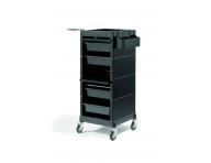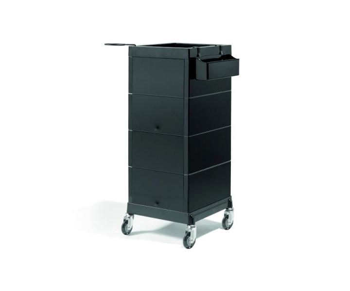 Pomocnik fryzjerski Sibel Discrete w kolorze czarnym to praktyczny i niezastąpiony element wyposażenia salonu fryzjerskiego. Posiada 4 praktyczne szuflady, uchwyt na suszarkę do włosów i praktyczną półkę na narzędzia, którą można powiesić na wózku. Szuflady można zamknąć za pomocą dwóch przesuwnych drzwiczek z magnetycznym mocowaniem. Pomocnik zapewni komfort i wygodę podczas pracy. Dzięki kółkom można go przemieszczać w dowolne miejsce.