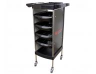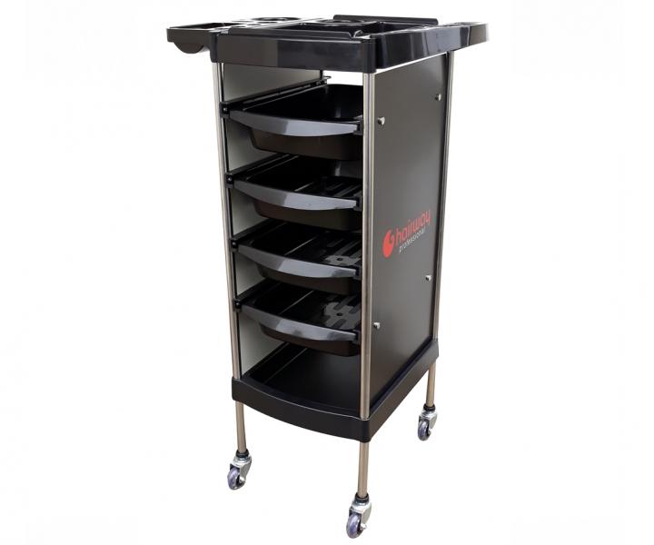 Wózek fryzjerski Hairway Oskar jest bardzo praktyczny i posiada przestronną przestrzeń do przechowywania z 4 wysuwanymi szufladami. Wyposażony jest w górne półki z wgłębieniami na miseczki do koloryzacji i uchwyty na akcesoria takie jak suszarka do włosów, folia aluminiowa i szczotki. Dodatkową przestrzeń do przechowywania stanowią półki. Wózek ten zapewni komfort pracy dzięki dużym kółkom (o średnicy 5,5 cm) umożliwiającym jego przemieszczanie w dowolne miejsce. Produkt ma bardzo stabilną konstrukcję w czarnym kolorze.