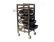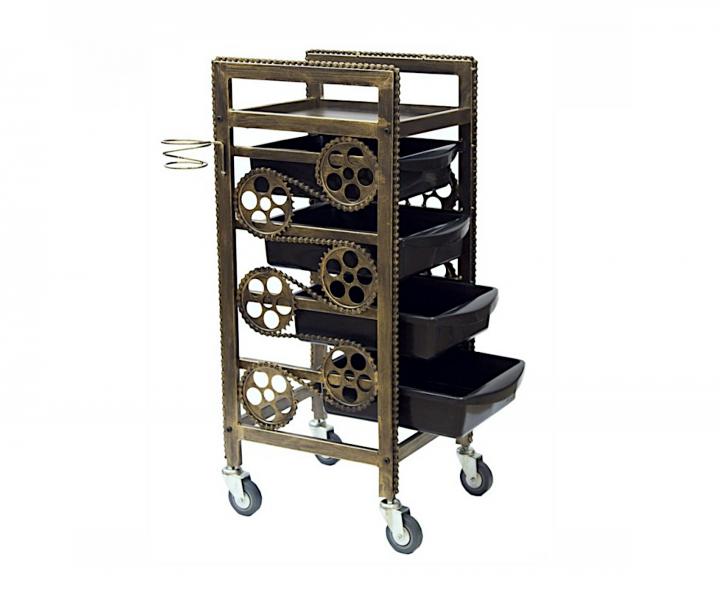 Wózek fryzjerski Hairway Ramon stanie się nie tylko praktycznym, ale przede wszystkim stylowym wyposażeniem salonu fryzjerskiego lub barberskiego. Górna półka i 4 wysuwane szuflady zapewniają dużo miejsca do przechowywania. Solidna metalowa konstrukcja z wykończeniem z patynowanego brązu posiada nie tylko stylowe elementy dekoracyjne, ale także praktyczny uchwyt na suszarkę do włosów. Duże gumowe kółka o średnicy 7,3 cm zapewniają doskonałą mobilność i umożliwiają przemieszczanie wózka w dowolne miejsce kiedy tylko zajdzie taka potrzeba. Wózek ten nie tylko zapewni komfort pracy, ale swoim wyglądem podkreśli także wyjątkowy styl Twojego salonu.