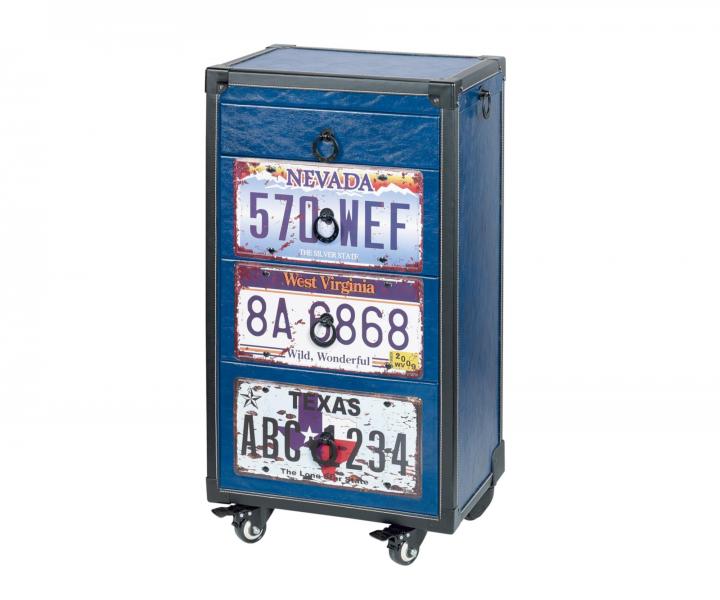 Pomocnik fryzjerski Sibel Barber w stylu retro w kolorze niebieskim jest wyposażony w trzy duże szuflady o wysokości 16 cm i jedną małą szufladę o wysokości 7 cm. Mała górna szuflada jest podzielona i nadaje się do małych akcesoriów takich jak nożyczki, grzebienie, szczotki itp. Po obu stronach pomocnika znajdują się wysuwane półki z otworami na różne urządzenia. Dzięki czterem kółkom z blokadą pomocnikiem można łatwo manewrować.