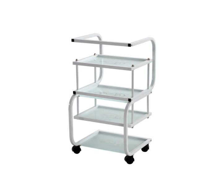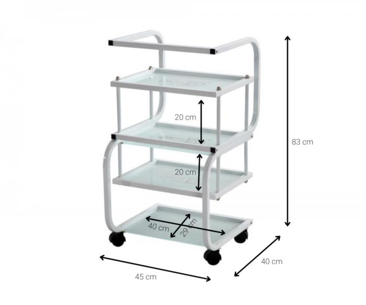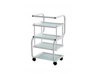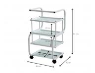 Praktyczny pomocnik kosmetyczny z czterema półkami, na kółkach. Idealnie nadaje się na przyrządy kosmetyczne, kosmetyki lub dowolny sprzęt w salonie, do którego potrzebny jest dostęp. Dobrze wyprofilowany uchwyt ułatwia przemieszczanie.