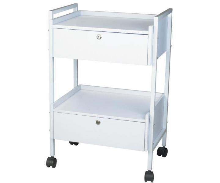 Pomocnik kosmetyczny z dwiema zamykanymi drewnianymi szufladami i metalową ramą. Uchwyty boczne i kółka zapewniają łatwe przemieszczanie pomocnika.