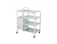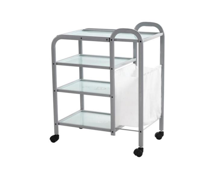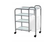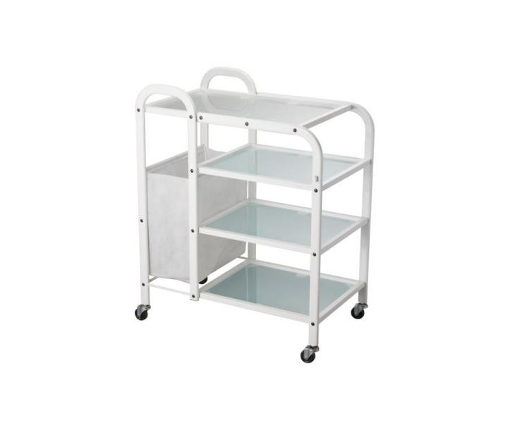 Praktyczny pomocnik kosmetyczny z czterema półkami, na kółkach, jest idealny do przechowywania różnych narzędzi kosmetycznych, kosmetyków czy innego sprzętu w salonie. Pomocnik posiada podręczny materiałowy kosz na ręczniki. Kółka zapewniają łatwe przemieszczanie pomocnika.