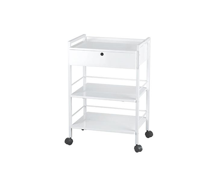 Pomocnik kosmetyczny Weelko EASY z jedną zamykaną drewnianą szufladą, trzema drewnianymi półkami i metalową ramą. Uchwyty boczne i kółka zapewniają łatwe przemieszczanie pomocnika. Właściwości: - 1 zamykana szuflada - 3 półki - 4 kółka Kolor: biały Materiał: aluminium, drewno Wymiary produktu: 55 ,5 x 42 x 82 cm Waga produktu: 21 kg