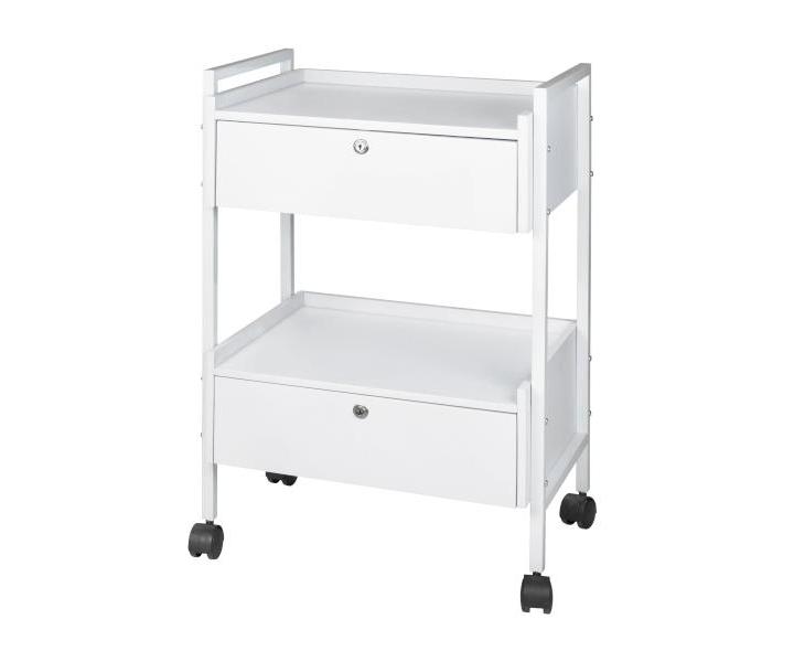 Pomocnik kosmetyczny Easy+ z dwiema zamykanymi drewnianymi szufladami i metalową ramą. Boczne uchwyty i kółka zapewniają łatwe przemieszczanie pomocnika.