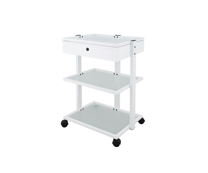 Pomocnik kosmetyczny Weelko Facile + z dwiema szklanymi półkami, zamykaną szufladą i metalową ramą w kolorze białym to elegancki dodatek do salonu. Uchwyty boczne i kółka zapewniają łatwe przemieszczanie pomocnika.