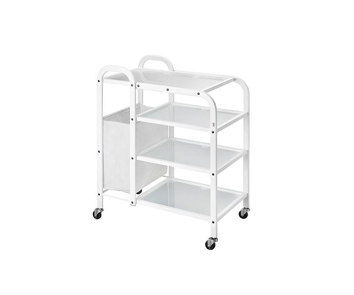 Pomocnik kosmetyczny Weelko Mobile z czterema półkami, na kółkach, jest idealny do przechowywania różnych narzędzi kosmetycznych, kosmetyków czy innego sprzętu w salonie. Pomocnik posiada podręczny materiałowy kosz na ręczniki który jest zdejmowany i nadaje się do prania ręcznego. Kółka i uchwyt zapewniają łatwe przemieszczanie pomocnika.
