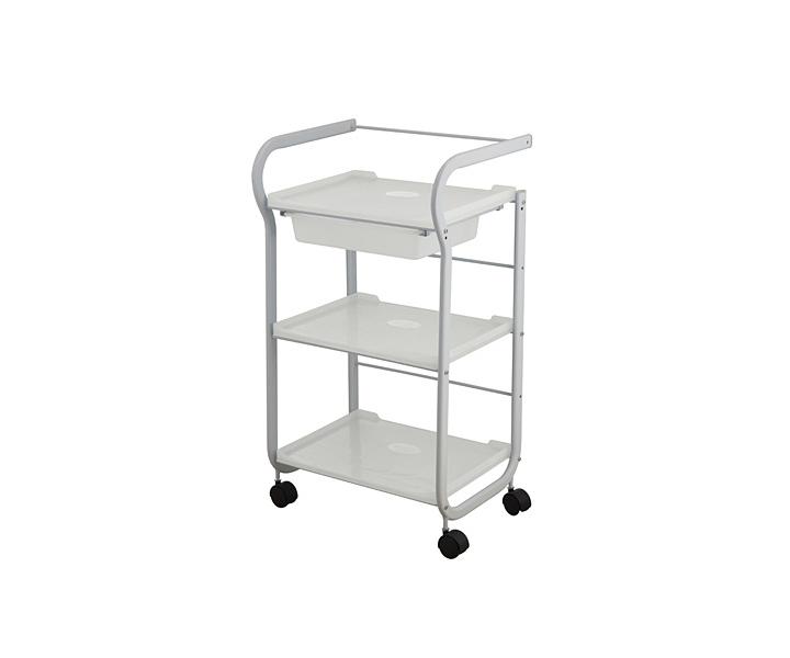 Pomocnik kosmetyczny Weelko Part o prostym designie wyposażony jest w trzy pojemne półki i jedną wysuwaną szufladkę. Przednia część pozwala na łatwe przechowywanie różnych urządzeń wielofunkcyjnych wyposażonych w wejścia z przodu. Dzięki kółkom i uchwytowi można go szybko i łatwo przesunąć w dowolne miejsce.