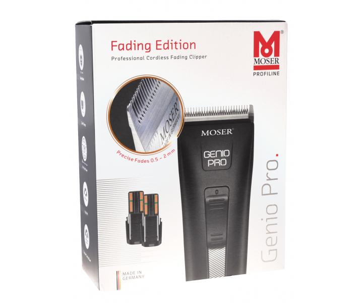 Profesjonalna maszynka do strzyżenia włosów Moser Genio Pro Fading Edition ze zintegrowanym ostrzem Fading Blade o szerokości 46 mm i regulowaną wysokością cięcia od 0,5 do 2 mm. Czas pracy aż 105 minut przy 80 minutach zasilania. Bardzo mocny silnik DC o prędkości 5750 obr/min. W zestawie 2 wymienne baterie, podstawka zasilająca, plastikowe nasadki 1,5 mm, 3 mm, 4,5 mm, 6 mm, szczoteczka do czyszczenia i olej.