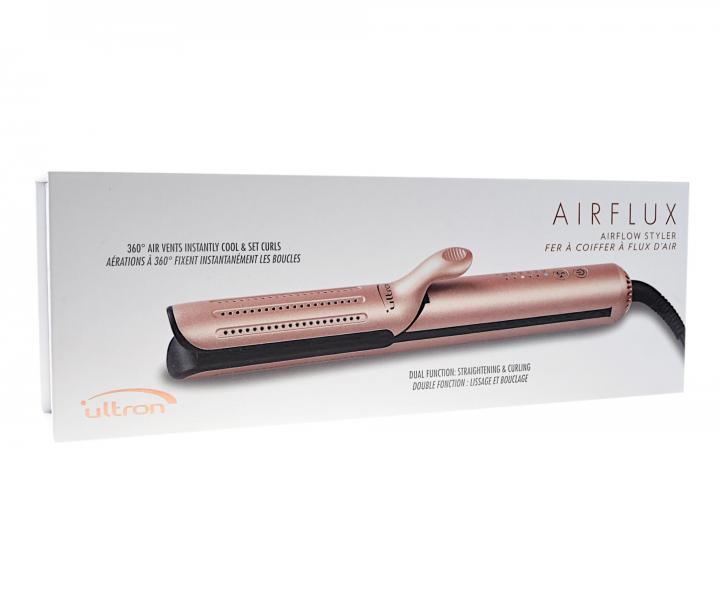 Profesjonalna prostownica Ultron Airflux XL posiada system płytek prostujących w połączeniu z otworami wentylacyjnymi nawiewu zimnego powietrza, które są umieszczone na obwodzie zewnętrznej strony kleszczy. Dzięki temu prostownica nadaje się do łatwego tworzenia prostych i falowanych fryzur. Strumień zimnego powietrza chłodzi fale podczas ich kręcenia i natychmiast je utrwala. Tytanowe płytki prostownicy nagrzewają się równomiernie, umożliwiając szybszą i delikatniejszą stylizację włosów. Wersja XL prostownicy z większymi płytkami o wymiarach 25 x 135 mm umożliwia szybszą stylizację włosów. Prostownica posiada pięciostopniową regulację temperatury w zakresie od 140°C do 220°C. O wybranej temperaturze informują diody LED na obudowie prostownicy. Obrotowy kabel o długości 3 metrów zapewnia łatwą manipulację.