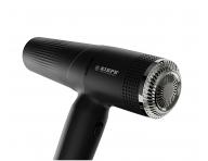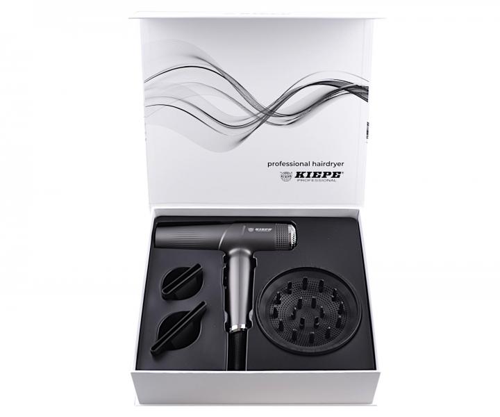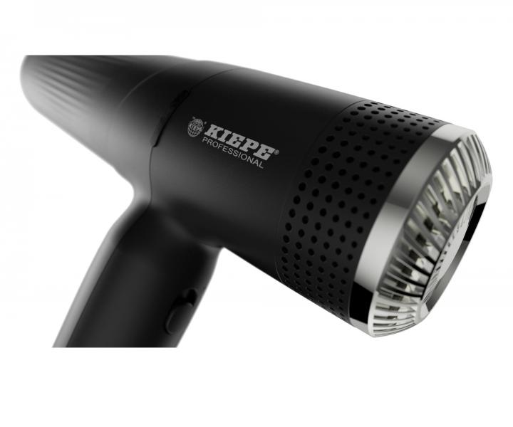 Profesjonalna suszarka do włosów Kiepe Professional Revolution Haidryer została wyposażona w bezszczotkowy silnik cyfrowy o prędkości 110 000 obrotów na minutę i mocy od 1500 do 1800 W. Urządzenie posiada 3 ustawienia prędkości nawiewu i 2 ustawienia temperatury powietrza. Wybraną prędkość i temperaturę można wygodnie ustawić za pomocą dwóch przycisków ze wskaźnikami LED umieszczonych po wewnętrznej stronie uchwytu suszarki. Dostępny jest również oddzielny przycisk zimnego powietrza. W celu zapobiegania niezamierzonemu ustawieniu temperatury lub prędkości nawiewu podczas suszenia, suszarka została wyposażona w blokadę odpowiednich przycisków znajdującą się na zewnętrznej stronie uchwytu. Suszarka jest cicha, a dzięki generatorowi jonów ujemnych także bardzo delikatna dla włosów. Nadaje im połysk oraz redukuje elektryzowanie. Obsługę suszarki ułatwia przewód o długości 3 metrów. W zestawie znajdują się dwie dysze powietrzne (95 mm i 65 mm) oraz dyfuzor.
