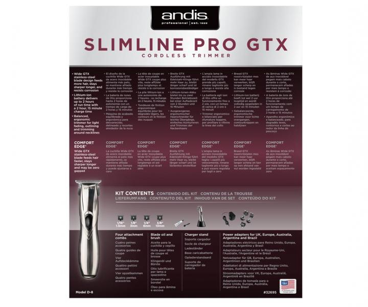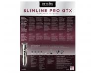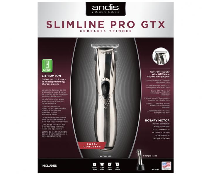 Profesjonalny trymer do włosów Andis Slimline Pro GTX jest wyposażony w precyzyjne ostrze ze stali nierdzewnej GTX o szerokości 38 mm, a jego ergononomiczny kształt zapewnia komfortowe użytkowanie przez cały dzień. Trymer jest wyposażony w akumulator litowo-jonowy i silnik rotacyjny zapewniający wysoką wydajność i bardzo cichą pracę. Czas pracy bezprzewodowej wynosi 120 minut, czas ładowania 135 minut. Wysokość cięcia wynosi 0,4 mm i może być zmniejszona na niższą tzw."zero gapped". W zestawie znajdują się wymienne nasadki 1,5 mm, 3 mm, 6 mm, 10 mm, stacja ładująca, olej do konserwacji, szczoteczka do czyszczenia, adapter sieciowy do Europy, Wielkiej Brytanii, Australii, Argentyny i Brazylii.