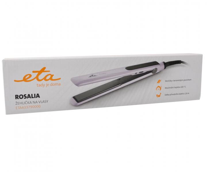 Prostownica do w³osów ETA Rosalia ma zaokr¹glone p³ywaj¹ce p³ytki z ceramiczn¹ powierzchni¹. O dzia³aniu prostownicy informuje kontrolka œwietlna. Dziêki elementom grzewczym prostownica bardzo szybko siê nagrzewa do po¿¹danej temperatury 220 °C, posiada równie¿ zabezpieczenie przed przegrzaniem. Obrotowy przewód umo¿liwia wygodn¹ obs³ugê. Posiada zamykane powierzchnie do prostowania i praktyczn¹ zawieszkê do zawieszania.