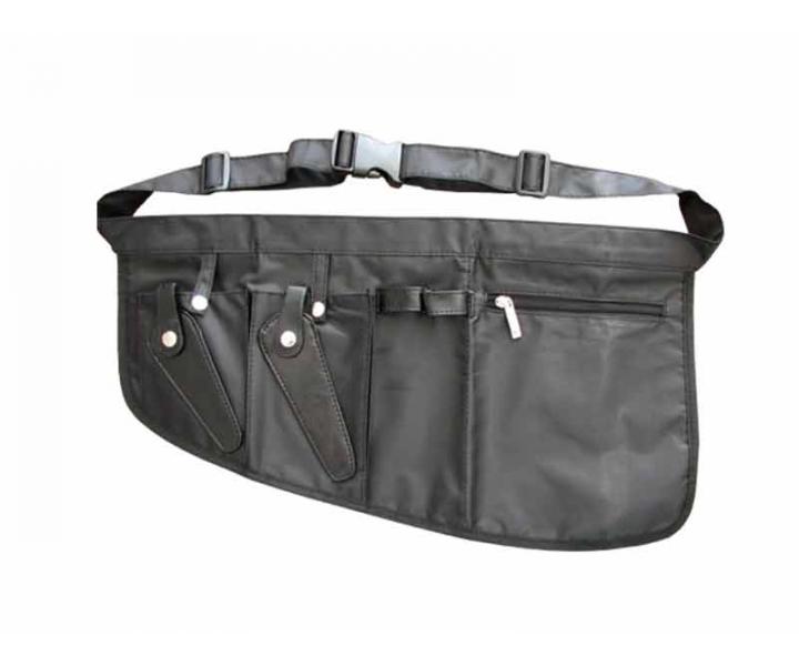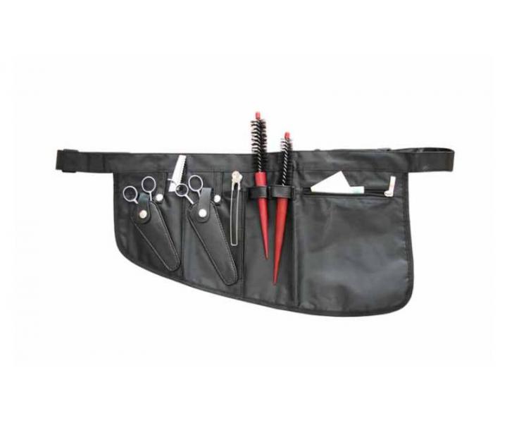 Bardzo lekki przybornik, kabura tekstylna Duko na nożyczki fryzjerskie i inne akcesoria (szczotki, grzebienie, klipsy). Długość paska wokół talii można dowolnie regulować. Przybornik nadaje się do prania, posiada 2 przegródki na nożyczki oraz dodatkowe schowki na grzebienie, spinki i inne akcesoria, w tym jedną kieszeń zapinaną na zamek.