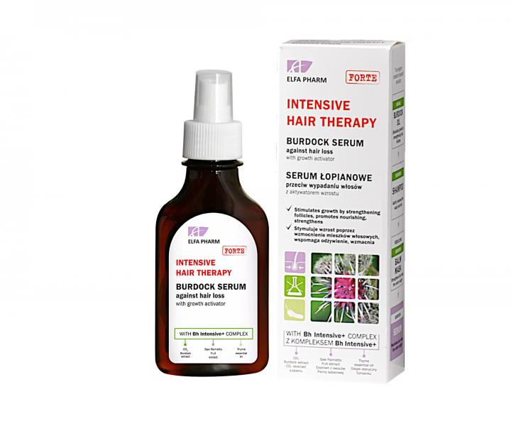 Serum Elfa Pharm Intensive Hair Therapy Burdock Serum to ostatni krok w trakcie kuracji przeciw wypadaniu włosów Elfa Pharm Intensive Hair Therapy. Unikalna formuła bazuje na korzeniu łopianu, który posiada szereg naturalnych, biologicznie aktywnych składników. Z powodzeniem rozwiązują one problemy mogące powodować wypadanie włosów. Formuła serum skutecznie ogranicza działanie enzymów odpowiedzialnych za wypadanie włosów oraz stymuluje mikrokrążenie w skórze głowy, co poprawia odżywienie mieszków włosowych. Ponadto działa odżywczo na cebulki włosów i naprawia ich uszkodzenia powierzchniowe. Aktywny kompleks Bh Intensive+ pomaga odbudować uszkodzoną strukturę włosa i stabilizuje fazy jego wzrostu w naturalnym cyklu. Serum doskonale odżywia skórę głowy, poprawiając tym samym jej funkcjonowanie. Przy regularnym stosowaniu, oprócz zmniejszenia przerzedzenia włosów, poprawie ulega wzrost nowych włosów i odbudowana zostaje ich struktura. Ponadto serum skutecznie przywraca siłę, gęstość i połysk każdego pasma.