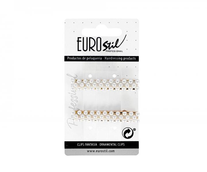 Spinka do w³osów Eurostil Professional w kolorze z³otym i d³ugoœci 5,5 cm jest ozdobiona licznymi ma³ymi pere³kami, dziêki czemu nadaje siê nie tylko dla panny m³odej w dniu œlubu, ale tak¿e na ró¿ne przyjêcia i inne uroczystoœci. Spinka jest wykonana z wytrzyma³ego materia³u wysokiej jakoœci, dziêki czemu mocno trzyma siê na w³osach. Dziêki klipsowi spinka jest ³atwa do zamocowania na w³osach. Opakowanie zawiera dwie spinki.