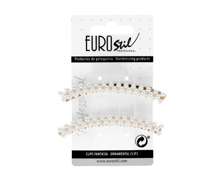 Spinka do w³osów Eurostil Professional w kolorze z³otym, o d³ugoœci 8 cm, ozdobiona jest szeregiem ma³ych pere³ek, dziêki czemu nadaje siê nie tylko dla panny m³odej w dniu œlubu, ale tak¿e na ró¿nego rodzaju przyjêcia i inne uroczystoœci. Spinka wykonana jest z mocnego materia³u wysokiej jakoœci, dziêki czemu mocno trzyma siê na w³osach. Spinka jest ³atwa do zamocowania na w³osach. Opakowanie zawiera dwie spinki.