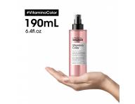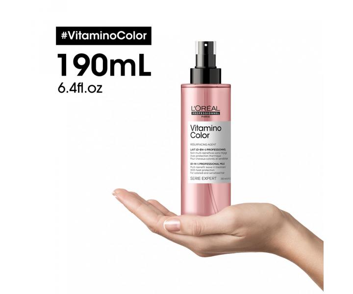 Spray do włosów farbowanych Loréal Serie Expert Vitamino Color 10 w 1 jest przeznaczony do wszystkich rodzajów włosów farbowanych. Wzbogacona neohesperydyną, tokoferolem, pantenolem i filtrem UV formuła pomaga chronić włókno włosa przed czynnikami zewnętrznymi i nadaje kolorowi blask.