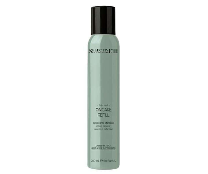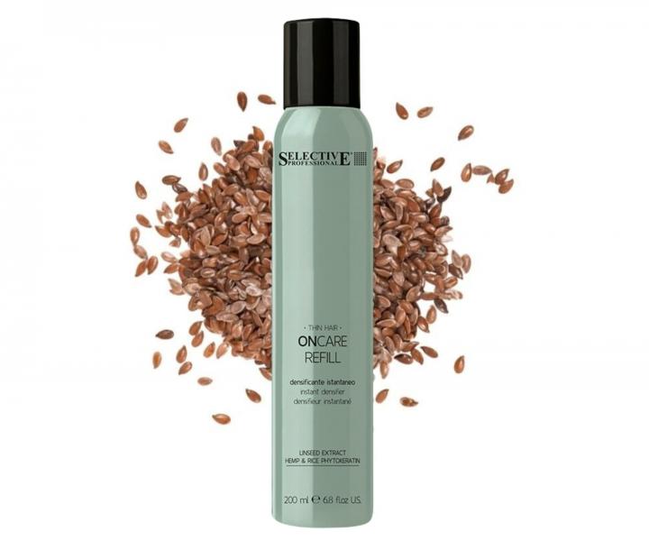 Kuracja w sprayu nadająca włosom objętość Selective Professional OnCare Refill Densifier jest idealna do włosów cienkich i przerzedzonych, które są łamliwe i potrzebują widocznej objętości i wzmocnienia. Zawiera nasiona lnu, które nadają włosom elastyczność, połysk i tak potrzebną siłę. Kwasy tłuszczowe Omega 3 nawilżają i wzmacniają łodygę włosa, zapobiegając łamliwości. Fitokeratyna z konopi i ryżu to naturalny ekstrakt z keratyn roślinnych, który wzmacnia i odbudowuje strukturę włosów. Jest bogata w składniki odżywcze, pomaga zregenerować osłabione włosy i utrzymuje niezbędne nawilżenie.
