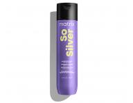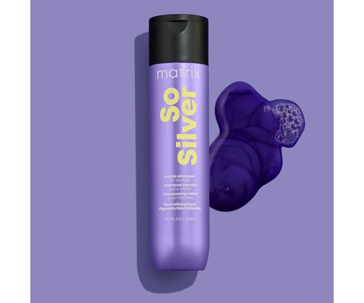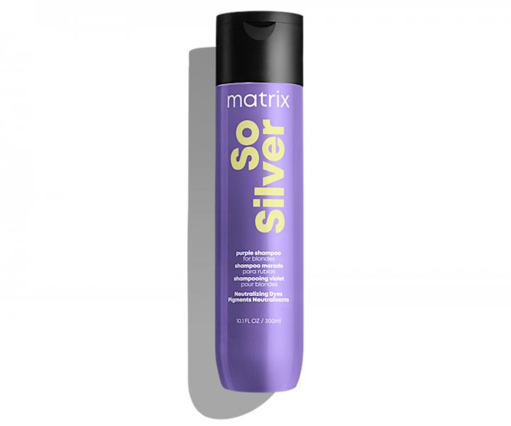 Szampon do włosów blond, z pasemkami i siwych Matrix So Silver neutralizuje niepożądane żółte i ciepłe odcienie. Szampon jest odpowiedni do włosów farbowanych i naturalnych blond. Zawiera fioletowe pigmenty, które utrzymują żywy kolor włosów blond. Szampon delikatnie oczyszcza i chroni kolor blond włosów, nie wysuszając ich.