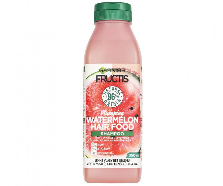 Szampon do włosów cienkich bez objętości Garnier Fructis Watermelon Hair Food o orzeźwiającym zapachu arbuza świetnie myje włosy delikatne, jednocześnie ich nie obciążając. Jego lekka piana delikatnie oczyszcza włosy, nawilża oraz sprawia, że wyglądają na zdrowsze i pełniejsze. Produkt wegański, wolny od silikonów i parabenów.