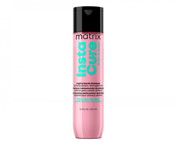 Szampon odbudowujący Matrix Instacure Build-A-Bond Mighty Bond Shampoo wyraźnie naprawia uszkodzenia włosów. Podczas gdy delikatnie oczyszcza włosy, z pomocą kwasu cytrynowego i skwalanu tworzy nowe wiązania włosów, odbudowując nawet bardzo zniszczone włosy. Kwas cytrynowy wnika głęboko we włókno włosa, wzmacnia je od wewnątrz i sprawia, że włosy stają się do 8 razy mocniejsze, podczas gdy skwalan natychmiast je wygładza i pozostawia każde pasmo jedwabiście miękkie. Innowacyjny szampon zmniejsza łamliwość i puszenie się włosów, nadaje się również do włosów farbowanych i rozjaśnianych. Wegański szampon o luksusowej różowej konsystencji tworzy gęstą i bogatą pianę o niezapomnianym zapachu orzeźwiających kwiatów cytrusowych, ambry drzewnej, fig i słodkich piwonii.