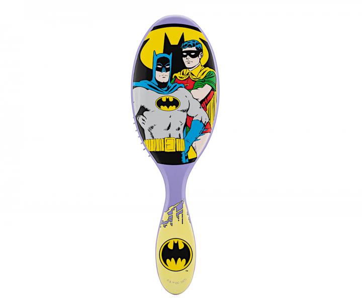 Szczotka Wet Brush Original Detangler zapewnia łatwe i delikatne rozczesywanie bez bolesnego ciągnięcia. Pneumatyczna podkładka została wyposażona w ekskluzywne włosie Intelliflex rozmieszczone w kilku rzędach. Dzięki temu szczotka delikatnie przesuwa się po poszczególnych pasmach włosów, ułatwiając rozczesywanie nawet o 55%. Jednocześnie zmniejsza to ryzyko rozdwajania się końcówek i łamania włosów podczas czesania nawet o 45%. Włosie zakończone jest małymi kuleczkami, które chronią skórę głowy przed podrażnieniami, jednocześnie delikatnie ją masując. Szczotka jest odpowiednia do rozczesywania wszystkich rodzajów włosów zarówno na mokro jak i na sucho. Ma zabawny design z motywem bohaterów DC - Batmana i Robina.