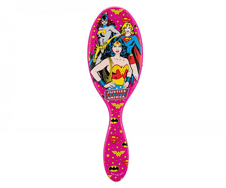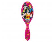 Szczotka Wet Brush Original Detangler zapewnia łatwe i delikatne rozczesywanie bez bolesnego ciągnięcia. Pneumatyczna podkładka została wyposażona w ekskluzywne włosie Intelliflex rozmieszczone w kilku rzędach. Dzięki temu szczotka delikatnie przesuwa się po poszczególnych pasmach włosów, ułatwiając rozczesywanie nawet o 55%. Jednocześnie zmniejsza to ryzyko rozdwajania się końcówek i łamania włosów podczas czesania nawet o 45%. Włosie zakończone jest małymi kuleczkami, które chronią skórę głowy przed podrażnieniami, jednocześnie delikatnie ją masując. Szczotka jest odpowiednia do rozczesywania wszystkich rodzajów włosów zarówno na mokro jak i na sucho. Ma zabawny design z motywem postaci DC Wonder Woman, Batgirl i Supergirl.