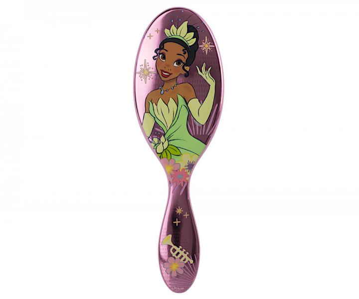 Szczotka Wet Brush Original Detangler zapewnia łatwe i delikatne rozczesywanie bez bolesnego ciągnięcia. Pneumatyczna podkładka została wyposażona w ekskluzywne włosie Intelliflex rozmieszczone w kilku rzędach. Dzięki temu szczotka delikatnie przesuwa się po poszczególnych pasmach włosów, ułatwiając rozczesywanie nawet o 55%. Jednocześnie zmniejsza to ryzyko rozdwajania się końcówek i łamania włosów podczas czesania nawet o 45%. Włosie zakończone jest małymi kuleczkami, które chronią skórę głowy przed podrażnieniami, jednocześnie delikatnie ją masując. Szczotka jest odpowiednia do rozczesywania wszystkich rodzajów włosów zarówno na mokro jak i na sucho. Ma zabawny motyw Disneya przedstawiający postać księżniczki Tiany.