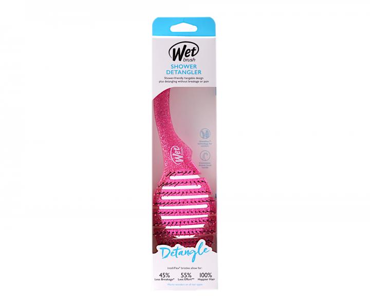 Szczotka Wet Brush Shower Detangler zapewnia łatwe i delikatne rozczesywanie włosów bez bolesnego ciągnięcia. Ponadto jest idealna do rozprowadzania produktów do pielęgnacji włosów. Dzięki specjalnej konstrukcji Omniflex szczotka podczas czesania dopasowuje się do kształtu głowy, co zapobiega podrażnieniom skóry. Ekskluzywne włosie IntelliFlex umieszczone w kilku rzędach na korpusie szczotki, delikatnie przesuwa się po poszczególnych pasmach włosów, ułatwiając ich rozczesywanie aż o 55%. Jednocześnie zmniejszają ryzyko rozdwajania się końcówek i łamania włosów podczas czesania nawet o 45%. Włosie zakończone jest małymi kuleczkami, które chronią skórę głowy przed podrażnieniami i jednocześnie ją masują. Szczotka nadaje się do rozczesywania mokrych włosów każdego rodzaju. Ma elegancki design z uchwytem zakończonym haczykiem ułatwiającym zawieszenie szczotki pod prysznicem. Szczotka nie nadaje się do stosowania podczas suszenia włosów suszarką.