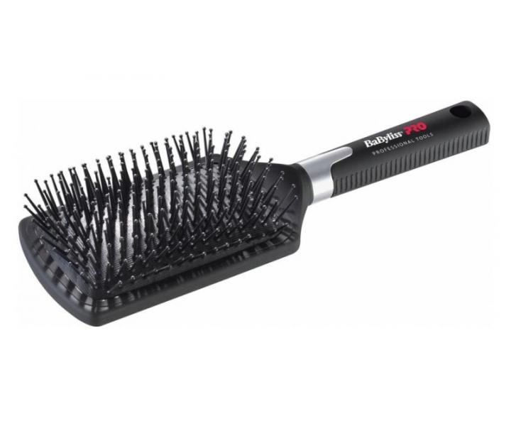 Duża szczotka BaByliss Pro BABNB2E jest idealna do rozczesywania średnich i długich włosów. Antypoślizgowy gumowany uchwyt doskonale leży w dłoni. Powierzchnia szczotki wyposażona jest w pneumatyczną poduszkę, która dopasowuje się do konturów głowy, a nylonowe włosie zakończone jest kulką.