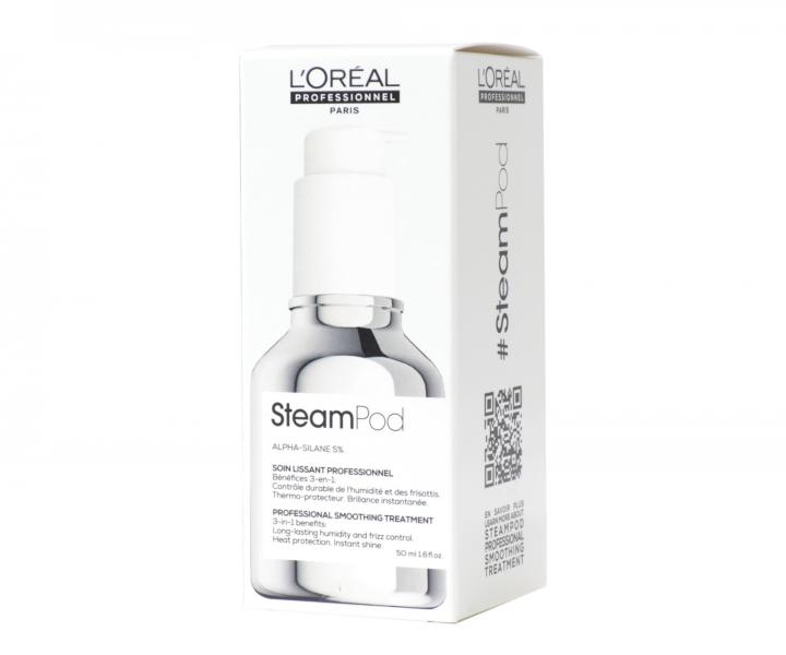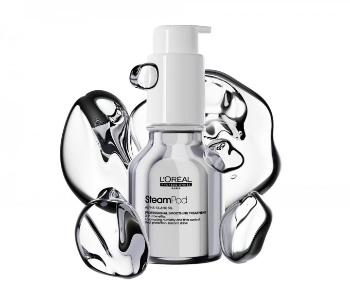 Profesjonalne serum wygładzające Loréal Professionnel SteamPod chroni włosy przed wysoką temperaturą podczas stylizacji oraz przed wilgocią. Bezwodna, skoncentrowana formuła serum jest wzbogacona aktywnym składnikiem Alpha-silane, który zapewnia ochronę termiczną do 230°C i niezawodną ochronę przed wilgocią do 80%. Serum o płynnej konsystencji można stosować na włosy przy użyciu dowolnej prostownicy, ale najlepsze rezultaty osiąga się przy użyciu prostownicy parowej Loréal Professionnel SteamPod. Stylizacja włosów jest do 3 razy szybsza przy użyciu serum, włosy są łatwiejsze do rozczesania i mniej łamliwe. Ponadto zapobiega puszeniu się włosów do 72 godzin. Po użyciu serum włosy natychmiast stają się bardziej miękkie, gładkie i lśniące.