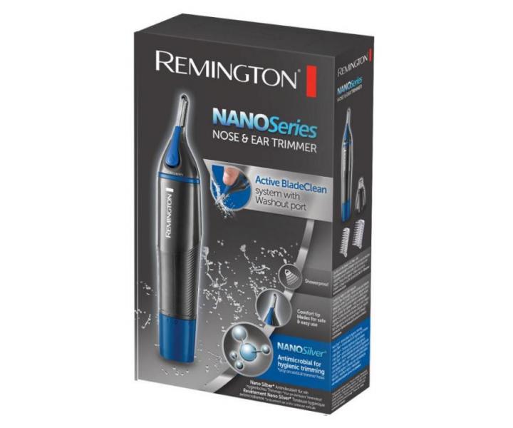 Trymer do włosów w uszach i nosie Remington NE3850 z systemem Active BladeClean ułatwiającym konserwację. Powierzchnia trymera pionowego zawiera antybakteryjne nanosrebro zapewniające bardziej higieniczne przycinanie. Urządzenie jest wodoodporne i odpowiednie do użytku pod prysznicem. Czas pracy na baterii wynosi 220 minut. Opakowanie zawiera dwustronny trymer pionowy z 2 grzebieniami do przycinania brwi oraz obrotową głowicą do włosów w nosie i uszach.