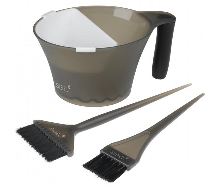 Zestaw do farbowania włosów Sibel zawiera podstawowe akcesoria do pasemek i farbowania włosów - przeznaczone do farbowania dwoma różnymi farbami. Zestaw zawiera miskę z oddzielną mniejszą miseczką i dwoma pędzlami do farbowania włosów. Miska ma zaznaczone podziałki do dokładnego odmierzania farby. Miska ma również antypoślizgowy uchwyt zapewniający bezpieczne trzymanie miski podczas mieszania i nakładania farby. Zestaw zawiera dwa pędzle w rozmiarach S i L.