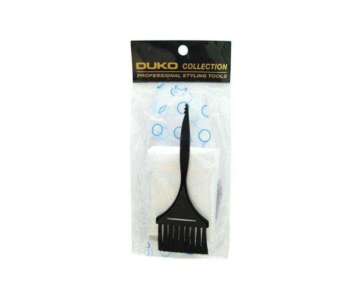 Zestaw do farbowania włosów i pasemek Duko Collection zawiera elastyczny perforowany czepek, parę foliowych rękawiczek i pędzelek do farbowania o szerokości 4 cm z haczykami na końcu. Czepek ma wstępnie zaznaczone otwory, przez które można przeciągnąć pasmo włosów za pomocą haczyka na końcu pędzla.